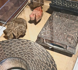 Mit einem Holzmodel werden Muster auf Stoffe gedruckt (Handdruck,